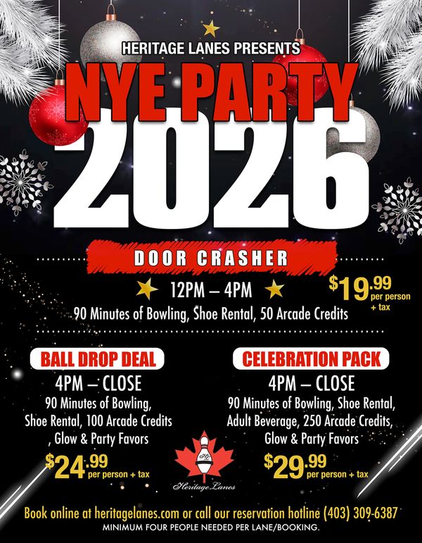Join us for the biggest bash of the year with New Year’s Eve Specials that’ll have you celebrating in style! Door Crasher Deal – Limited early-bird lanes with unbeatable pricing. The Ball Drop – Countdown on the big screens, party lights, and the perfect strike into midnight! Celebration Pack – Your all-in bundle to keep the good times rolling right into the new year! Lanes fill fast—secure your spot and roll into 2026 at Heritage Lanes.