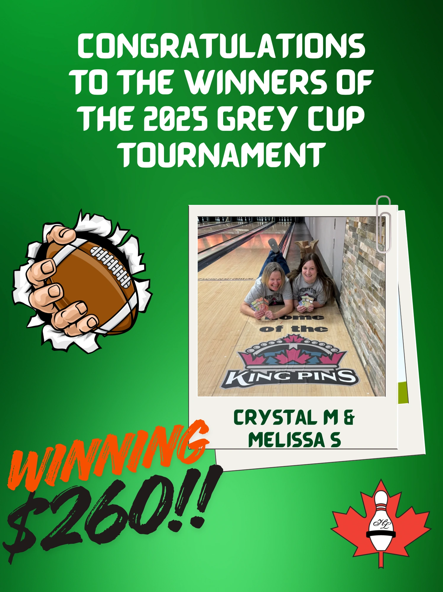 Ladies, gentlemen, and anyone still recovering from too many touchdown celebrations… we have our Grey Cup heroes! A massive, laughter-filled, victory-lap-worthy shoutout to Crystal and Melissa, who absolutely dominated the lanes like they were bowling for the King Pins!